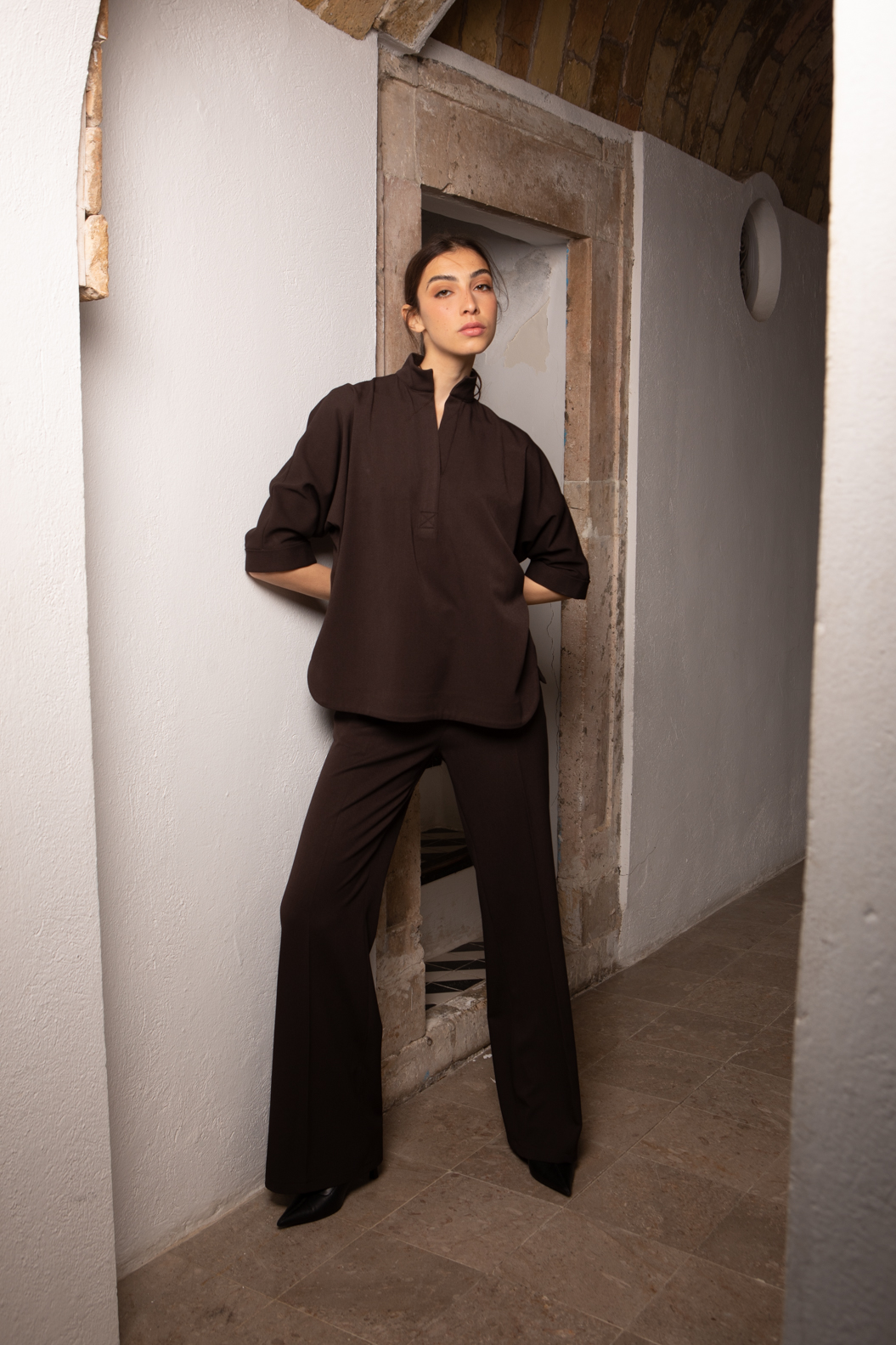 Chemise ample en crêpe diagonale marron à col officier élégant. La patte décorative à l’avant et les manches mi-longues à revers en font une pièce de caractère à part entière.
