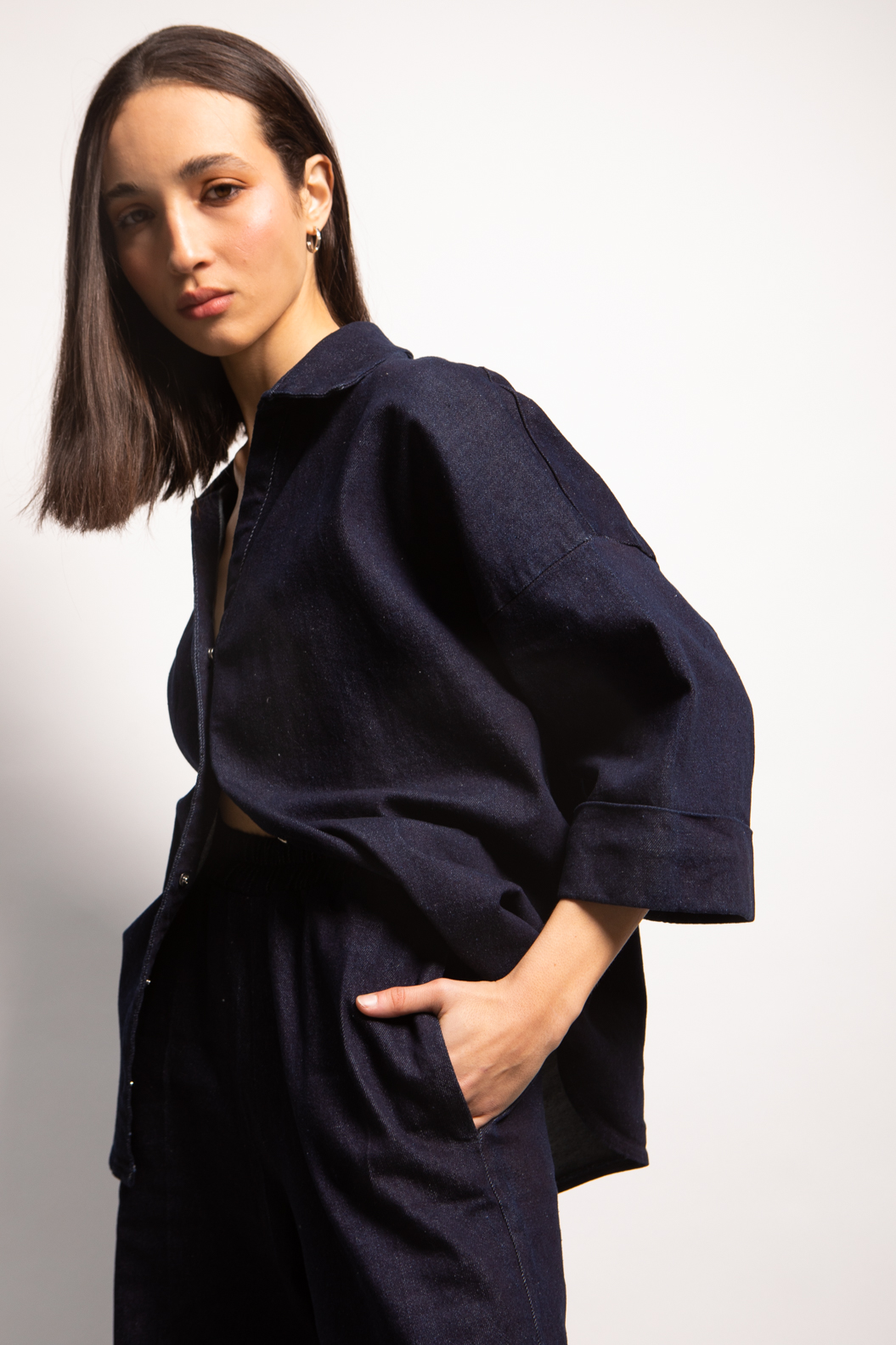Chemise en denim brut à col V et manches larges ¾ avec revers. La fermeture à pressions apporte une touche utilitaire à cette pièce intemporelle revisitée.