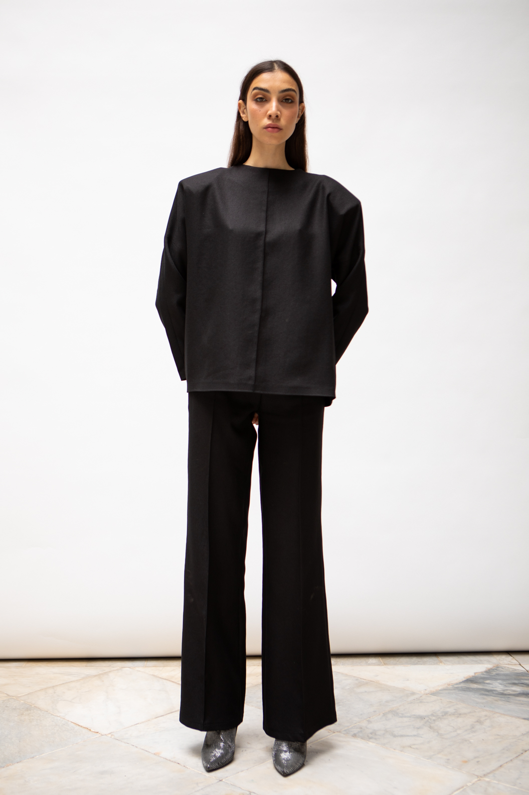 Ensemble femme tailleur en crêpe sergé — top structuré aux épaules marquées et pantalon large taille haute. Les volumes équilibrés allongent la silhouette pour un style sophistiqué et affirmé. Idéal pour une occasion habillée ou un look bureau chic. Création Estelle Collection, marque tunisienne.