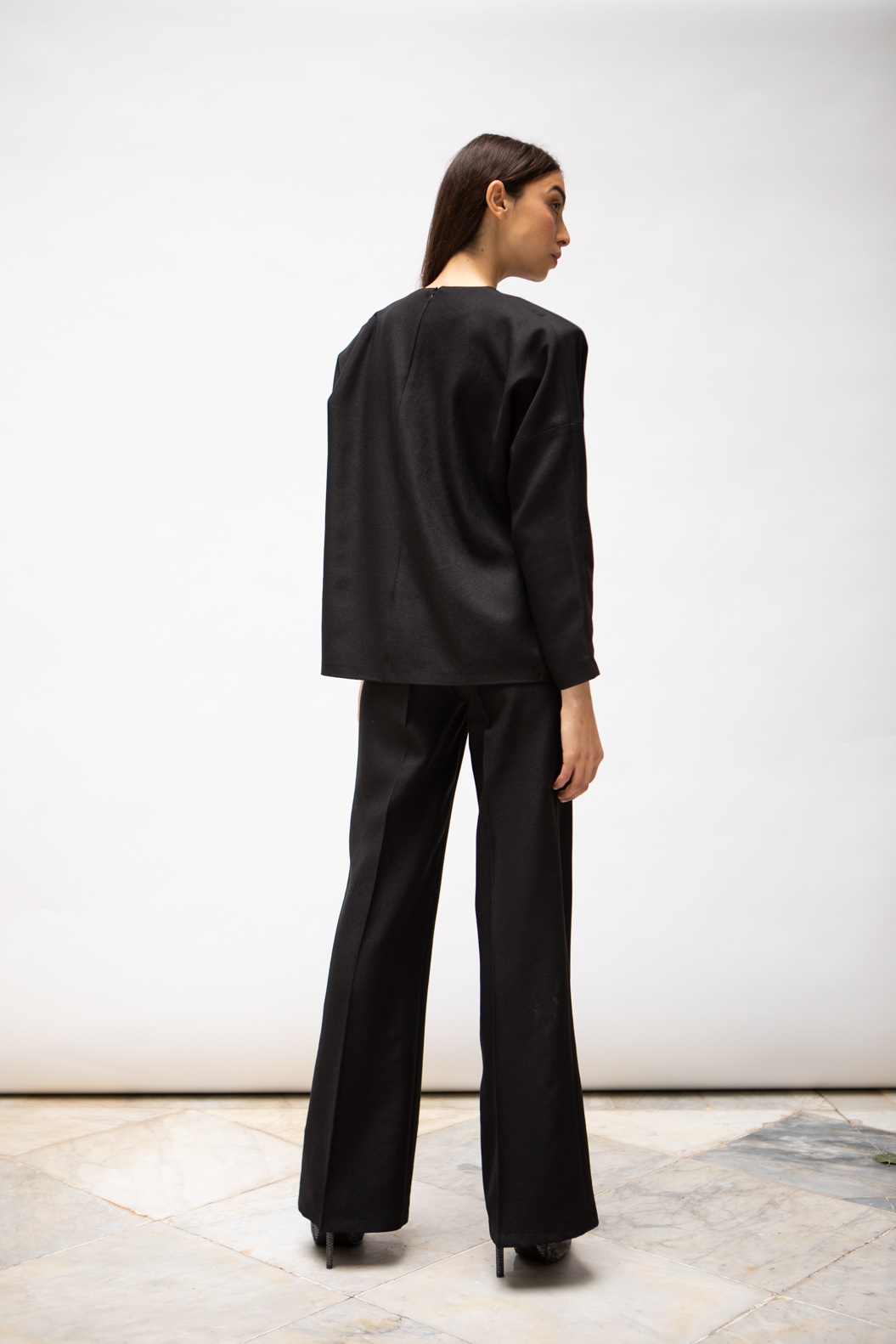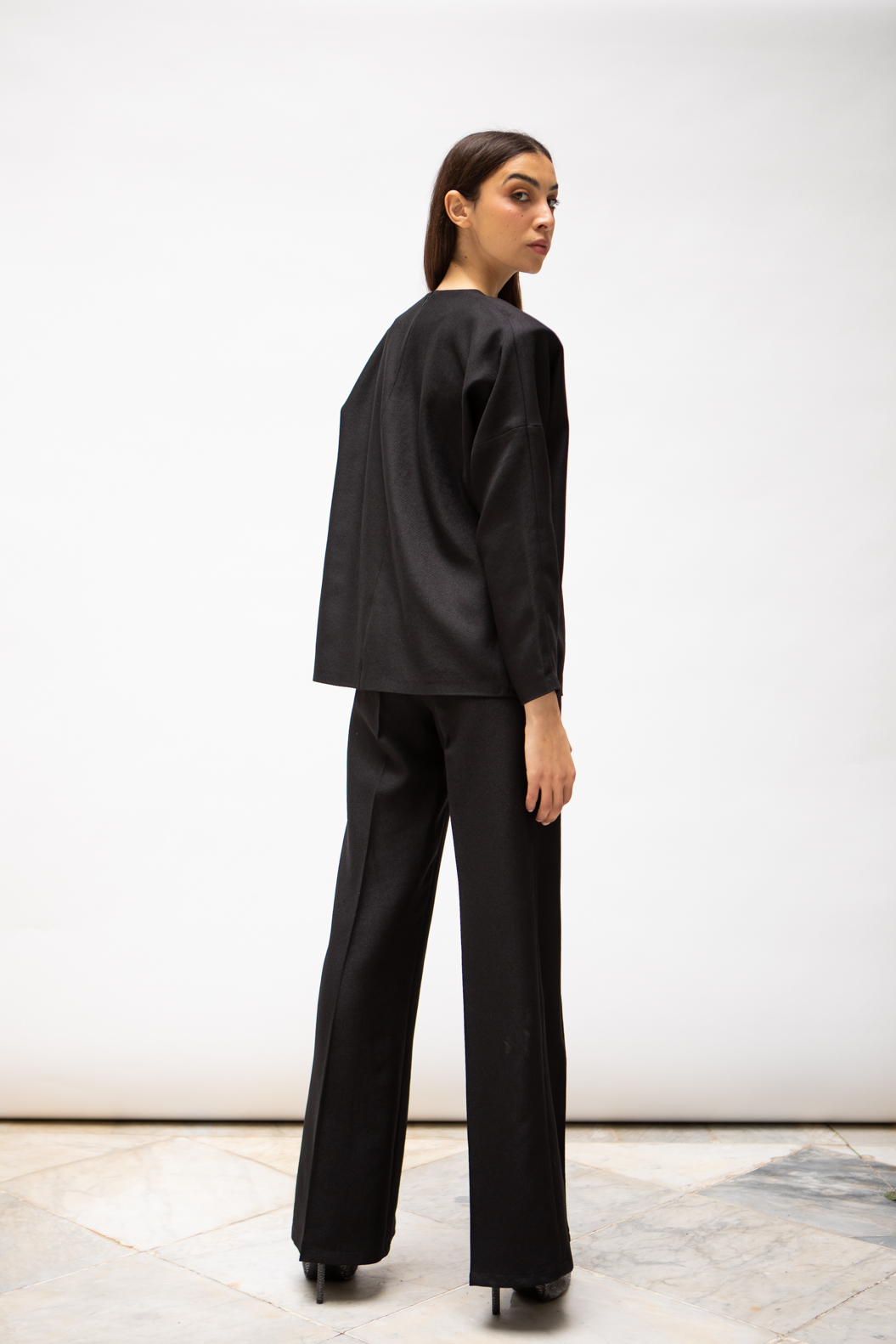 Ensemble en crêpe sergé avec top structuré et pantalon large taille haute.