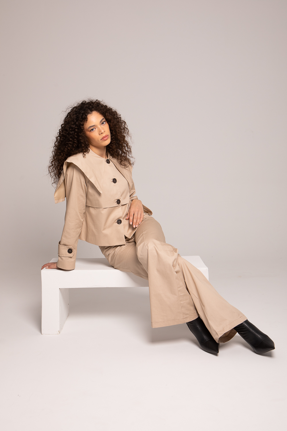 Un ensemble beige inspiré du trench, revisité avec modernité et féminité.