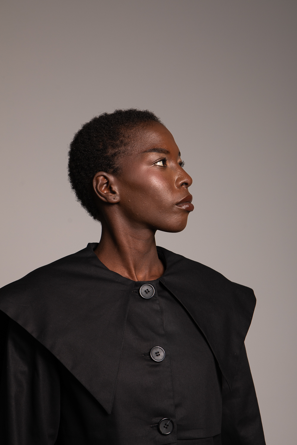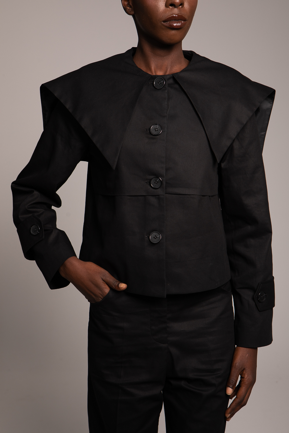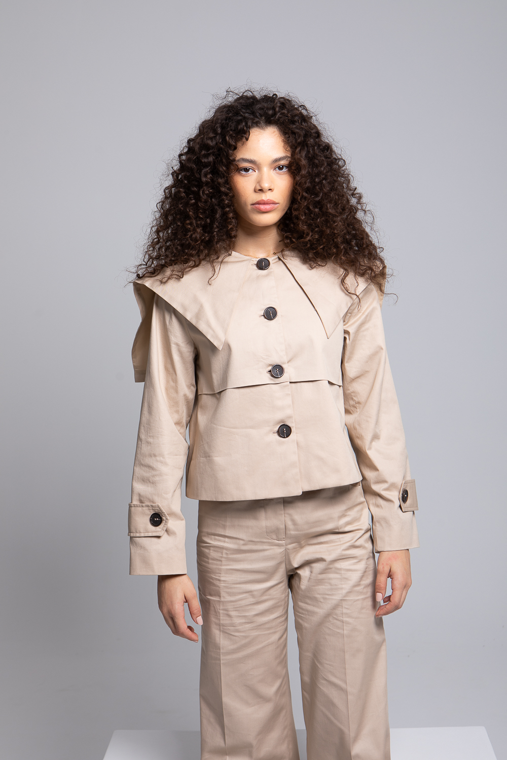 Sa veste courte, pensée comme une réinterprétation moderne du trench, offre un volume graphique et affirmé. Les grands boutons contrastés viennent rythmer la coupe, tandis que le pan façon cape insuffle une touche de mouvement et de liberté.