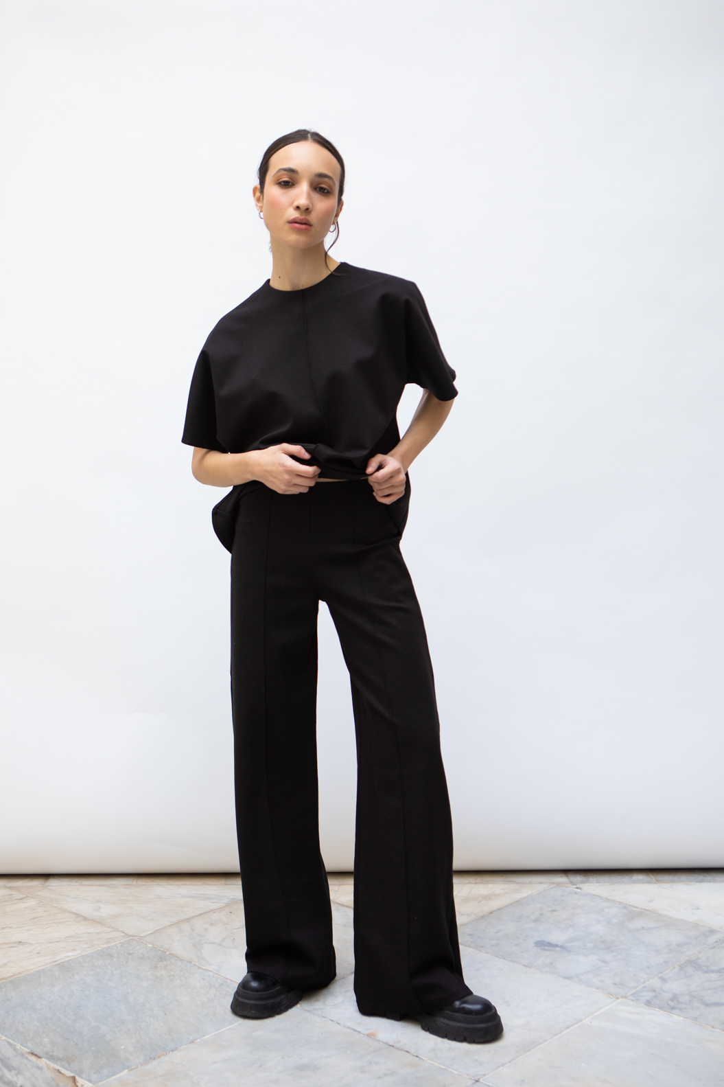 Pantalon droit à ceinture élastique avec nervures courant sur toute la longueur des jambes. Un pantalon précis qui s’accorde naturellement avec le pull assorti.