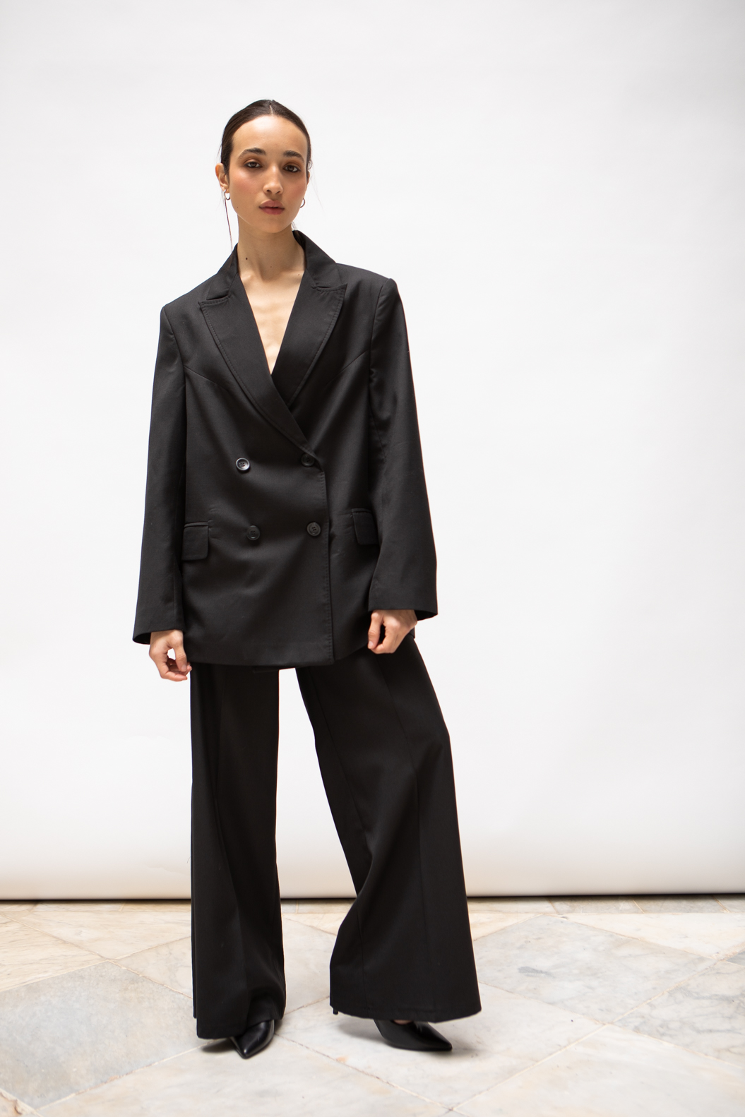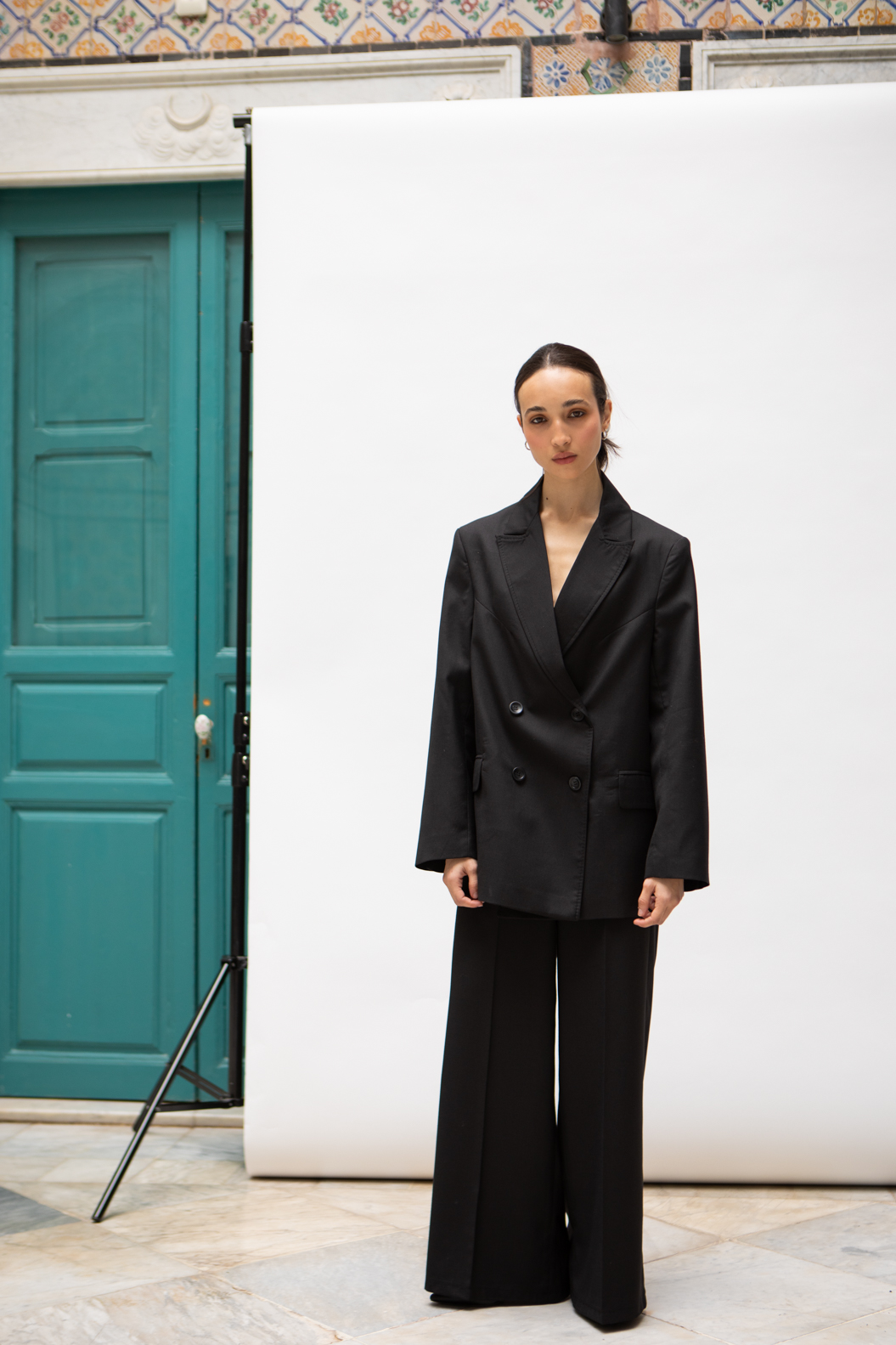 Pantalon femme taille haute en flanelle gris charbon — coupe fluide et structurée pour une silhouette élancée. Poches latérales fonctionnelles et maintien confortable toute la journée. À porter en ensemble coordonné avec le blazer assorti pour un look tailleur moderne, ou seul pour un style minimaliste chic. Création Estelle Collection, marque tunisienne.