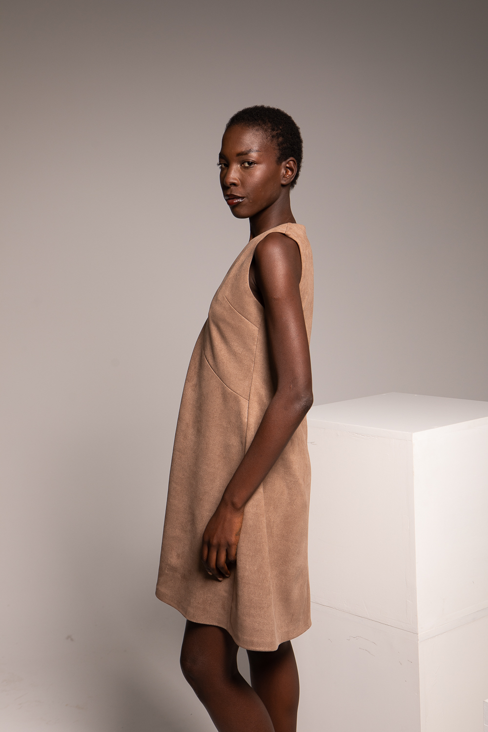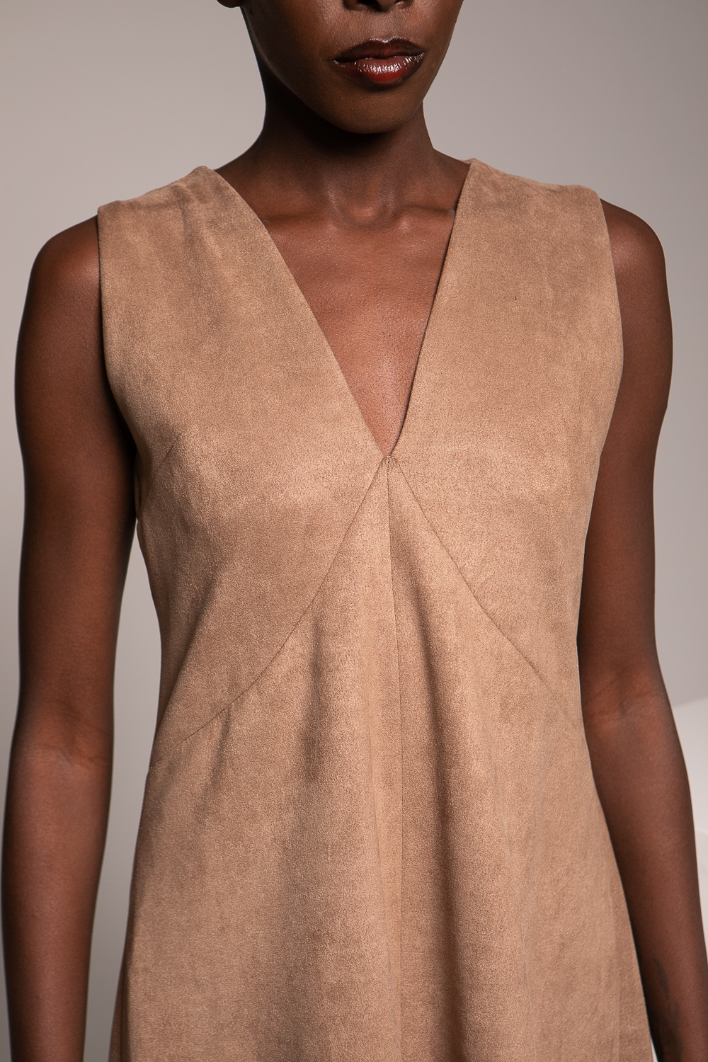 Robe courte sans manches en faux daim doux, coloris brun profond. Élégante et moderne, elle épouse la silhouette avec délicatesse pour un look automnal à la fois chic et confortable.