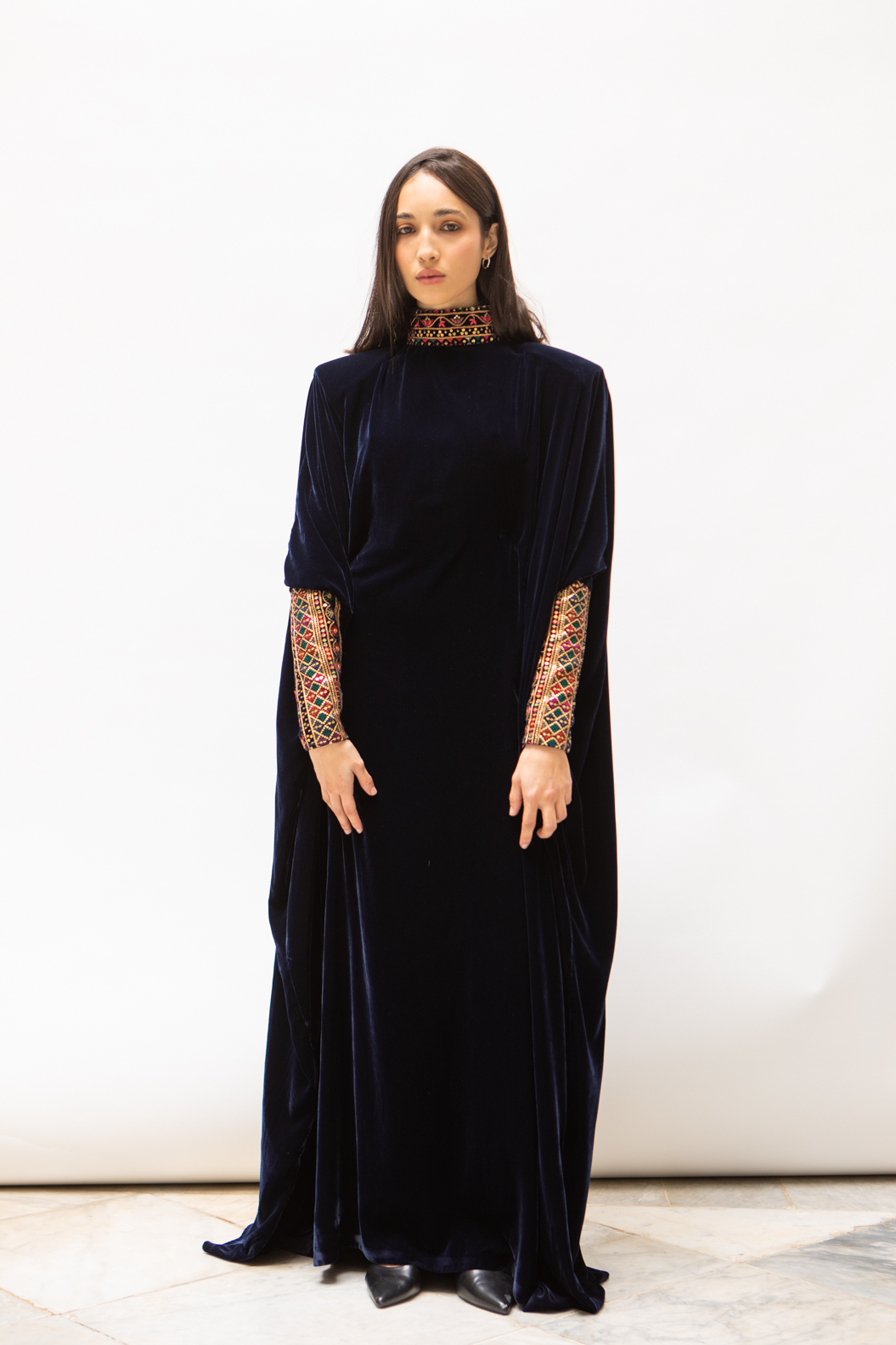 Robe longue bleu nuit en velours de soie avec broderies raffinées au col et aux manches.