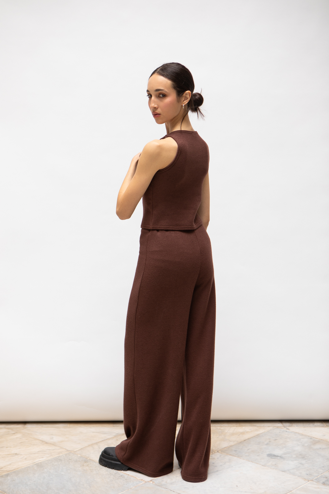 Ensemble femme 3 pièces en maille tricot légère — pantalon fluide, débardeur et gilet coordonné. Confort et élégance réunis dans un esprit minimaliste moderne. À porter ensemble pour un look total ou séparément pour plus de polyvalence au quotidien. Création Estelle Collection, marque tunisienne.