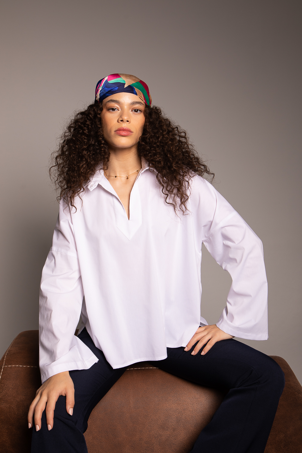 La Tunique Stella incarne la quintessence du chic minimal. Confectionnée en popeline de coton, elle se distingue par sa coupe fluide, son décolleté en V délicatement structuré et ses manches longues évasées qui insufflent un mouvement aérien.