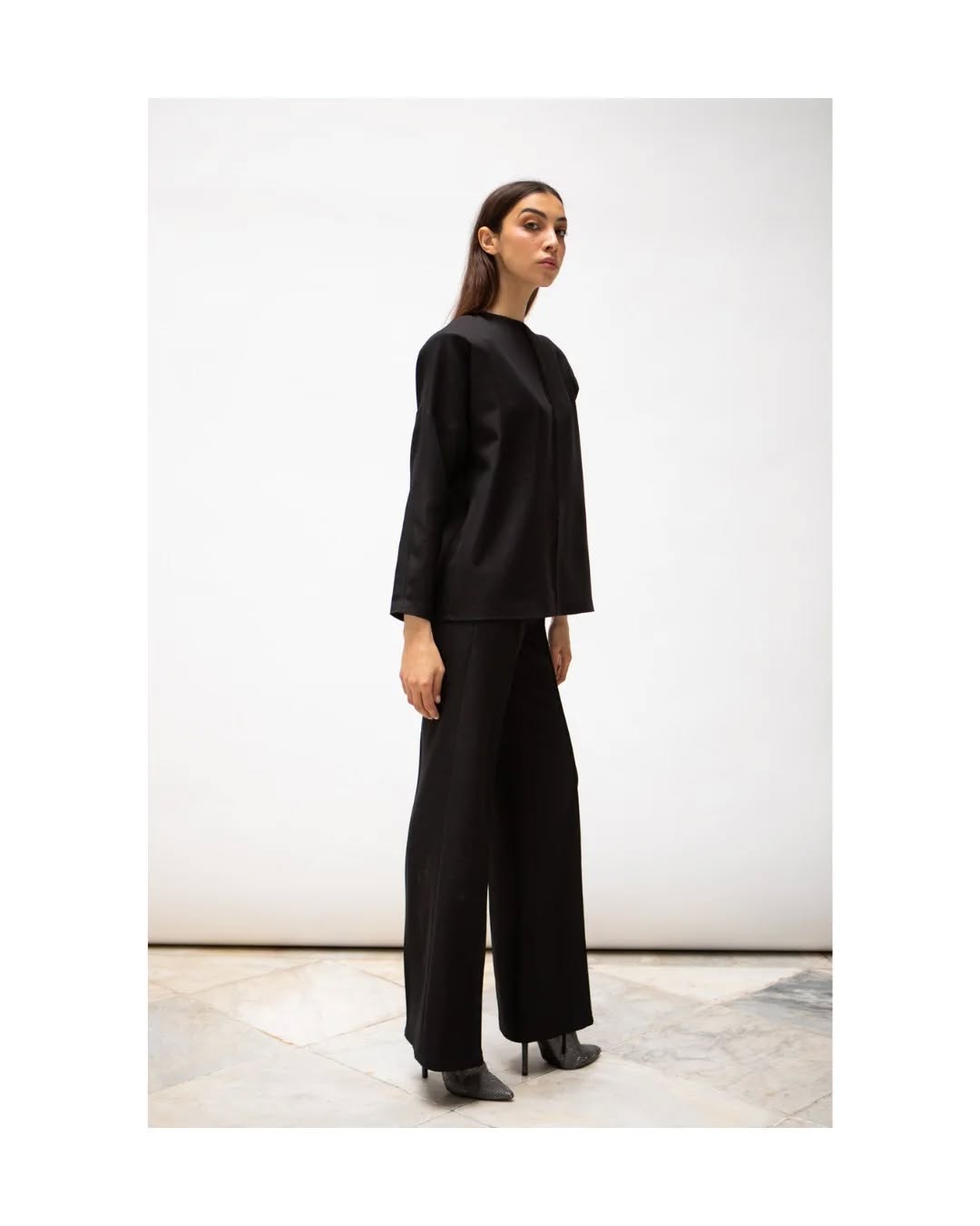 Modèle portant un ensemble noir sur mesure avec blazer croisé et pantalon large, talons noirs, dans un décor minimaliste avec des assiettes murales et un escalier en marbre.