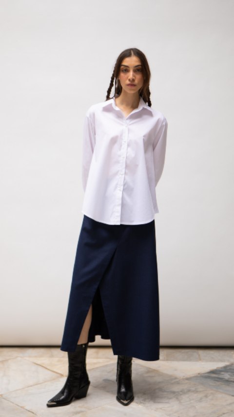Femme assise sur un fauteuil, portant une chemise blanche et une jupe longue bleu marine, avec des bottes noires.