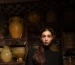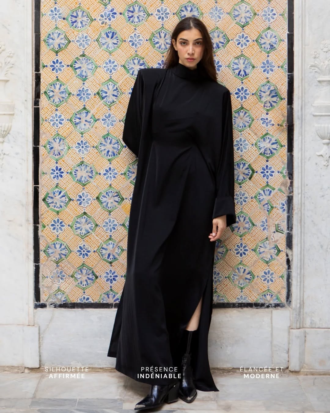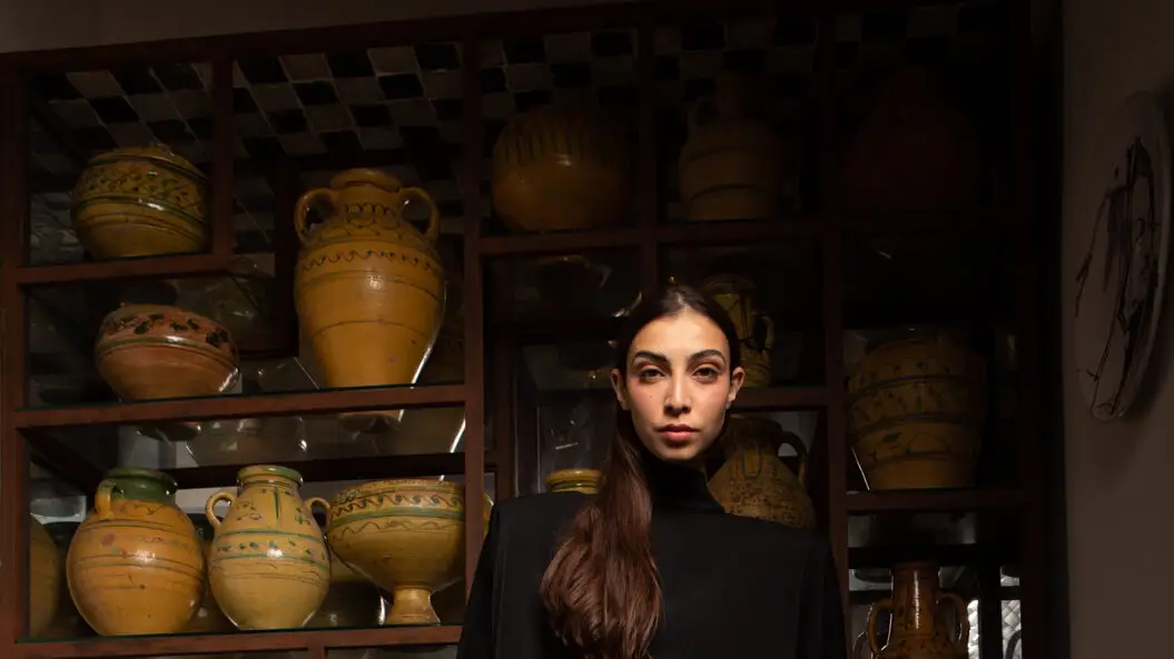 Femme vêtue d'une robe noire longue se tenant devant une étagère remplie de poteries jaunes et vertes, ambiance atelier, ambiance élégante et sobre