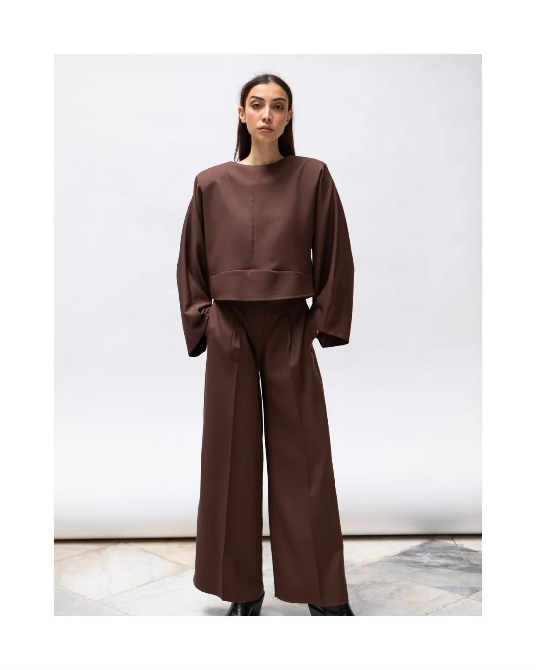 Deux silhouettes féminines portent des ensembles noirs et marron avec des manches amples devant une porte bleue ornée de rivets, sur un mur en pierre clair.