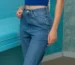 Portrait d'une jeune femme portant une tenue en denim bleu foncé, veste à col relevé et pantalon, assise près d'une véranda verte avec poterie décorative en arrière-plan.